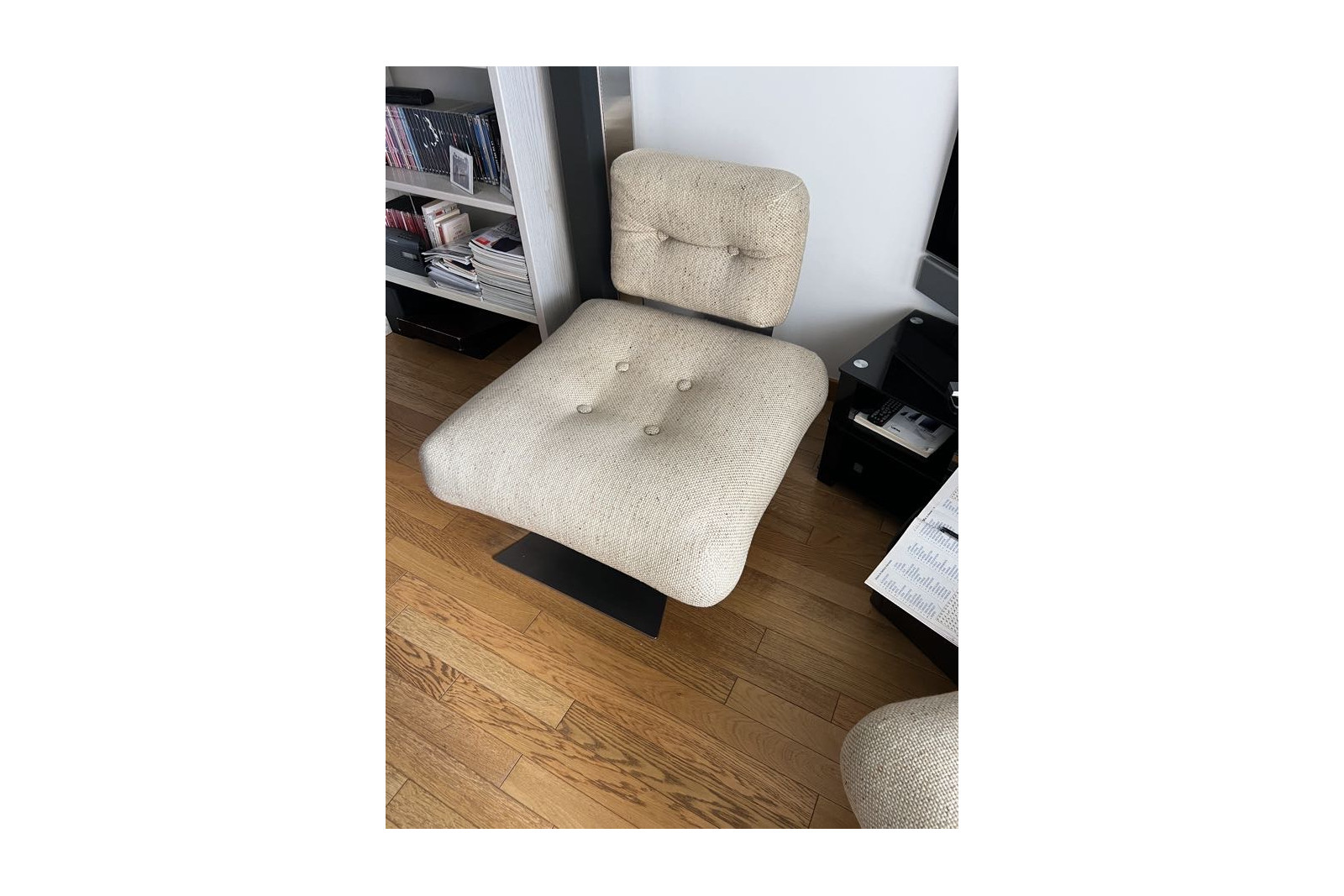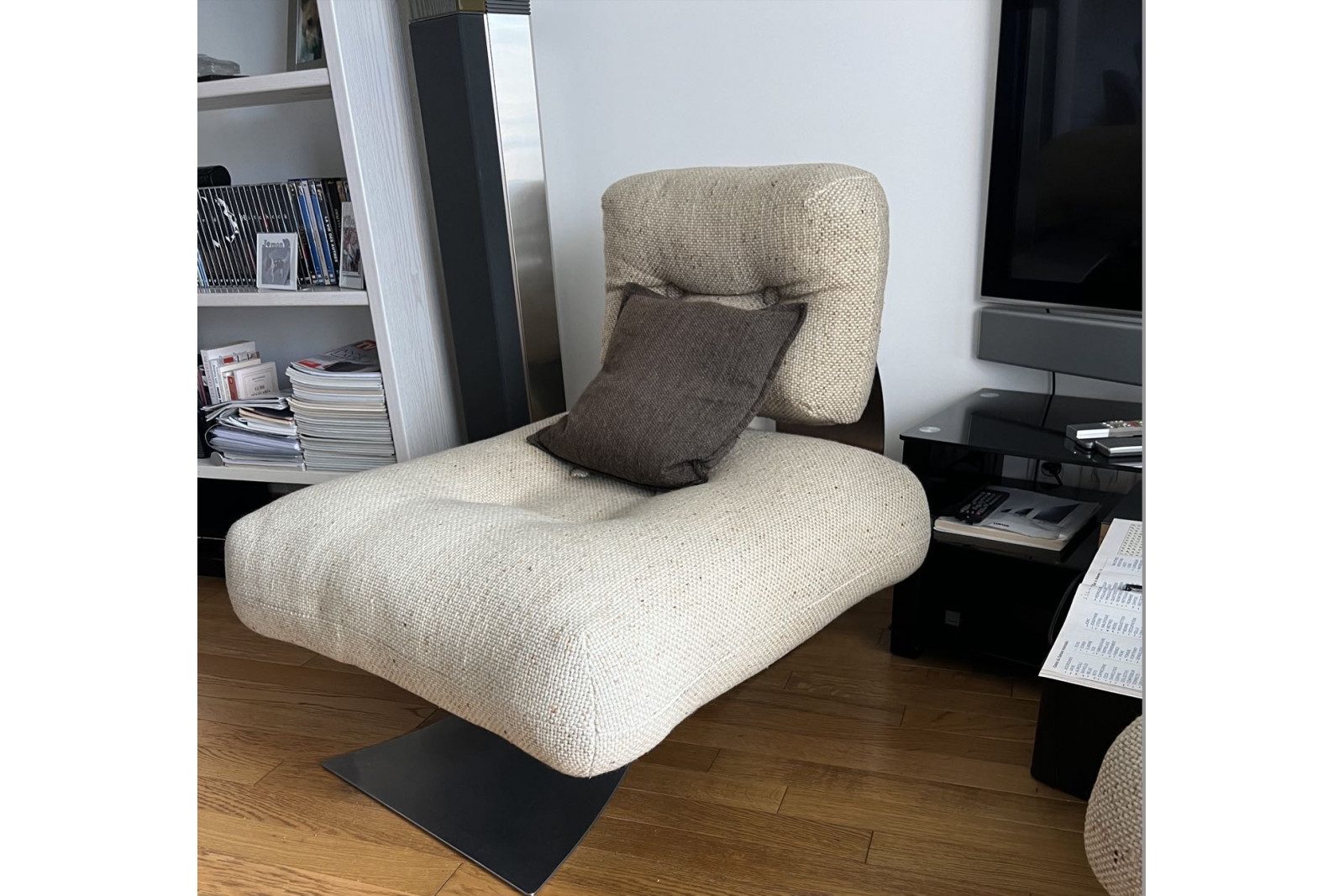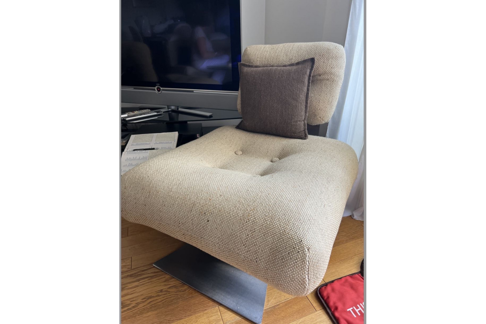 La structure en aluminium poli est d’une élégance rare, et l’assise généreuse en tissu d’origine (ou retapissée selon état) offre un confort souple et profond.