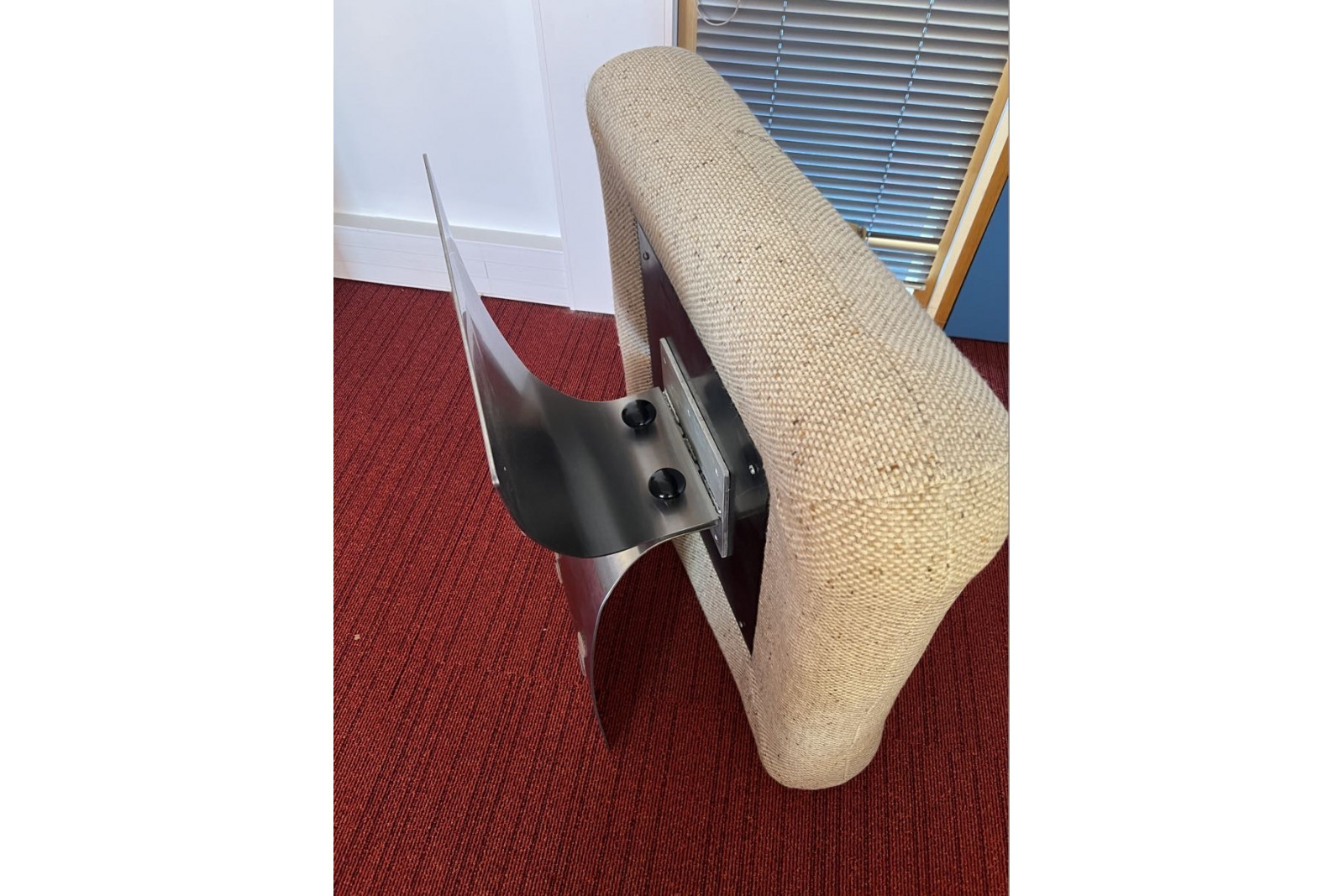 Cette assise sculpturale conjugue le confort enveloppant du tissu à une structure en aluminium tubulaire, emblématique du vocabulaire formel de Niemeyer : lignes courbes, équilibre suspendu, légèreté visuelle.