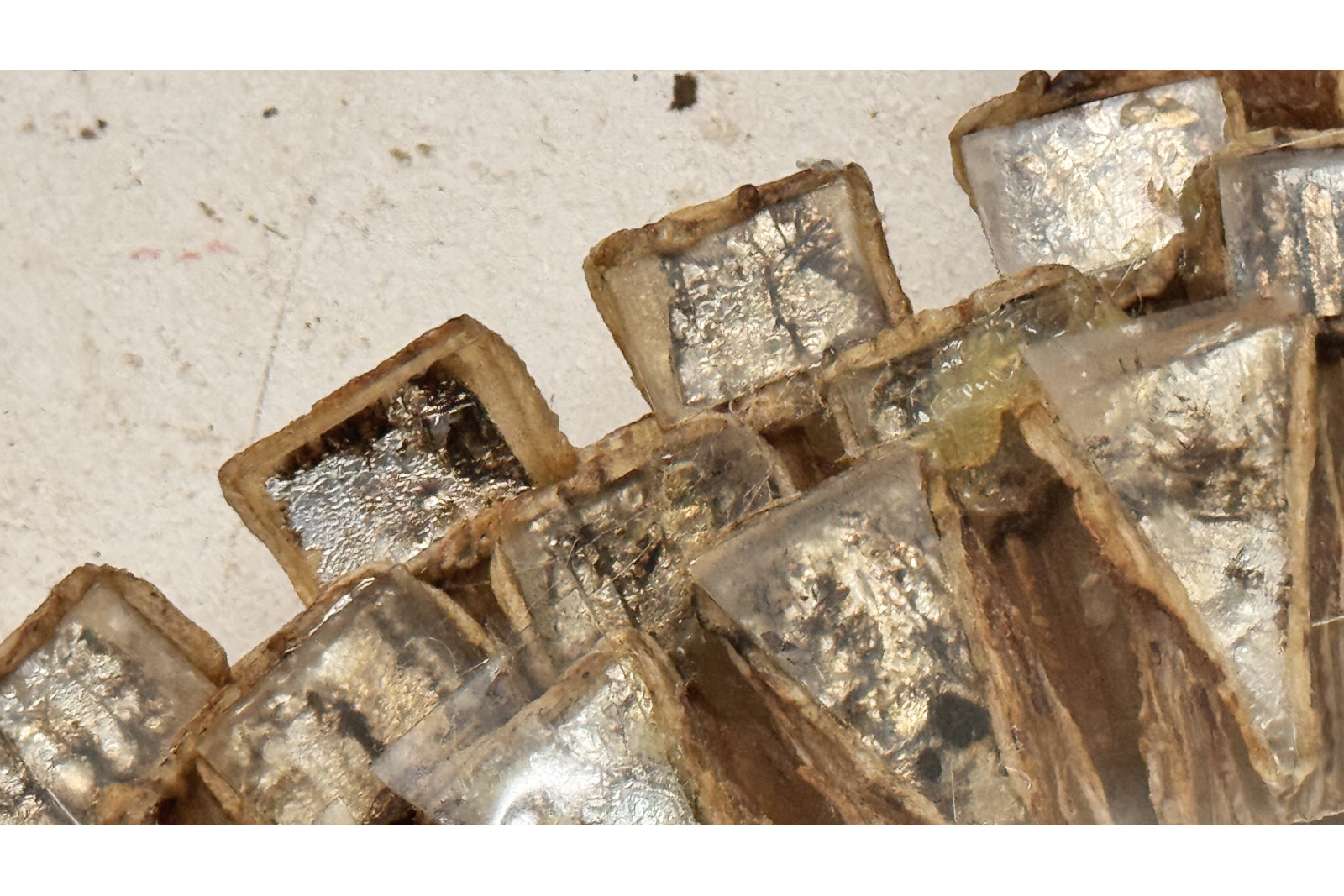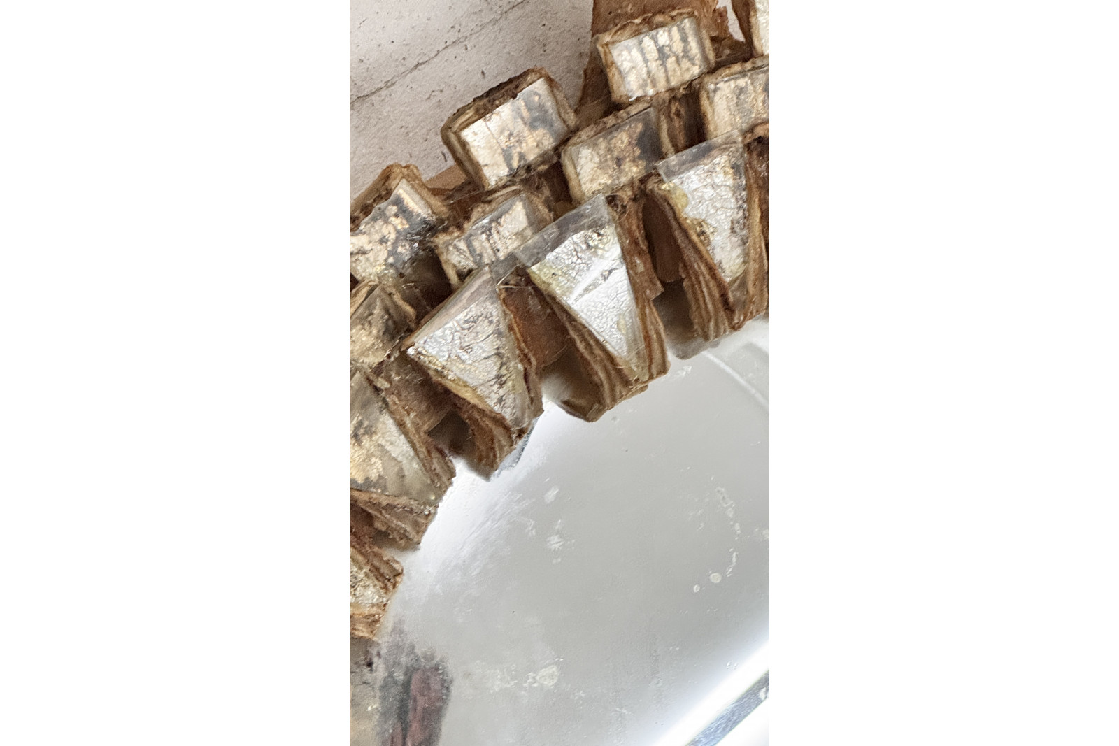 Miroir iconique de Line Vautrin, modèle Tudor, caractérisé par son cadre en talosel doré et son décor en relief d’inspiration médiévale.