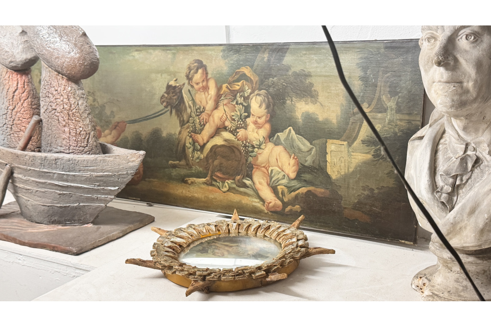Le miroir modèle Tudor de Line Vautrin est une œuvre emblématique du design décoratif français des années 1950. Réalisé en talosel, matériau signature de l’artiste, ce miroir se distingue par son cadre sculpté en relief, souvent orné de motifs évoquant l’architecture médiévale et les décors anciens.